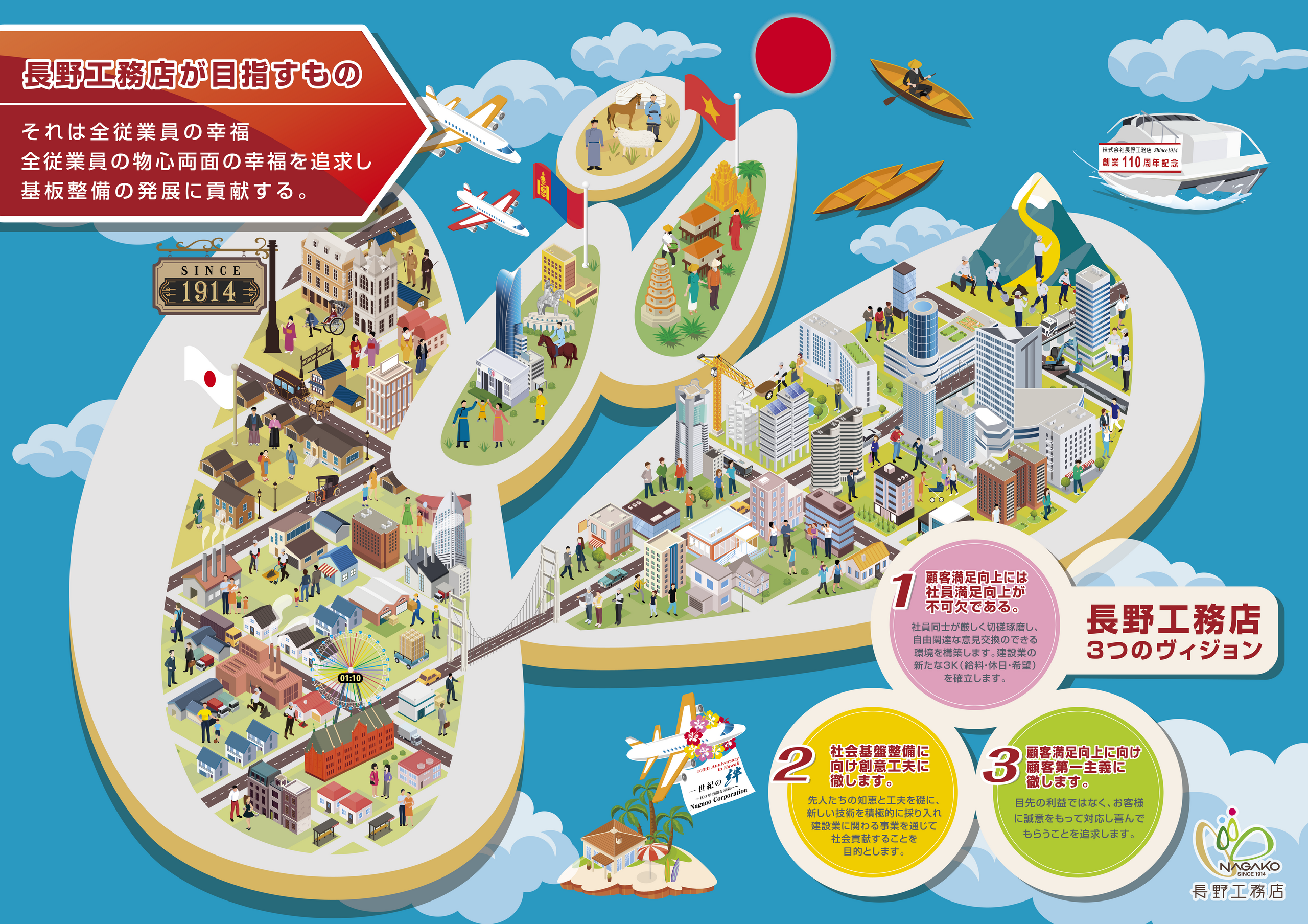Infographic 長野工務店のインフォグラフィックコンセプト このインフォグラフィックは長野工務店の長い歴史を描いています。1914年の創業から現在までインフラ整備など人々の暮らしを豊かにする仕事に従事してきた歴史と、変わりゆく街並みや時代の変化を感じられるものとなっています。 真ん中の3つの島には、いま長野工務店を支えてくれているモンゴル人社員とベトナム人技能実習生に敬意を表し両国を表現しました。また、全体的なデザインは110年目に新しくしたロゴマークをイメージしています。